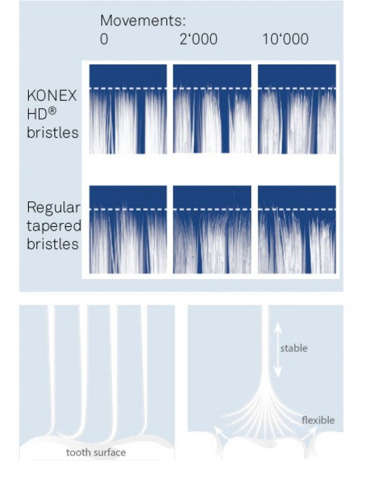 Konex HD®-borst är fem gånger tunnare än vanliga UltraSoft-borst, vilket gör dem UltraUltraSoft. Detta ger komfort under borstningen, särskilt för de med känsliga tänder och tandkött, vilket gör uppgiften att borsta tänderna till en trevlig upplevelse.