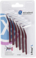 Miradent I-Prox L mellanrumsborste XX-fine har ett vinklat borsthuvud som gör det lättare att komma åt mellan de bakre tänderna och från insidan. Långt, ergonomiskt skaft och plastöverdragen metalltråd för effektiv rengöring.